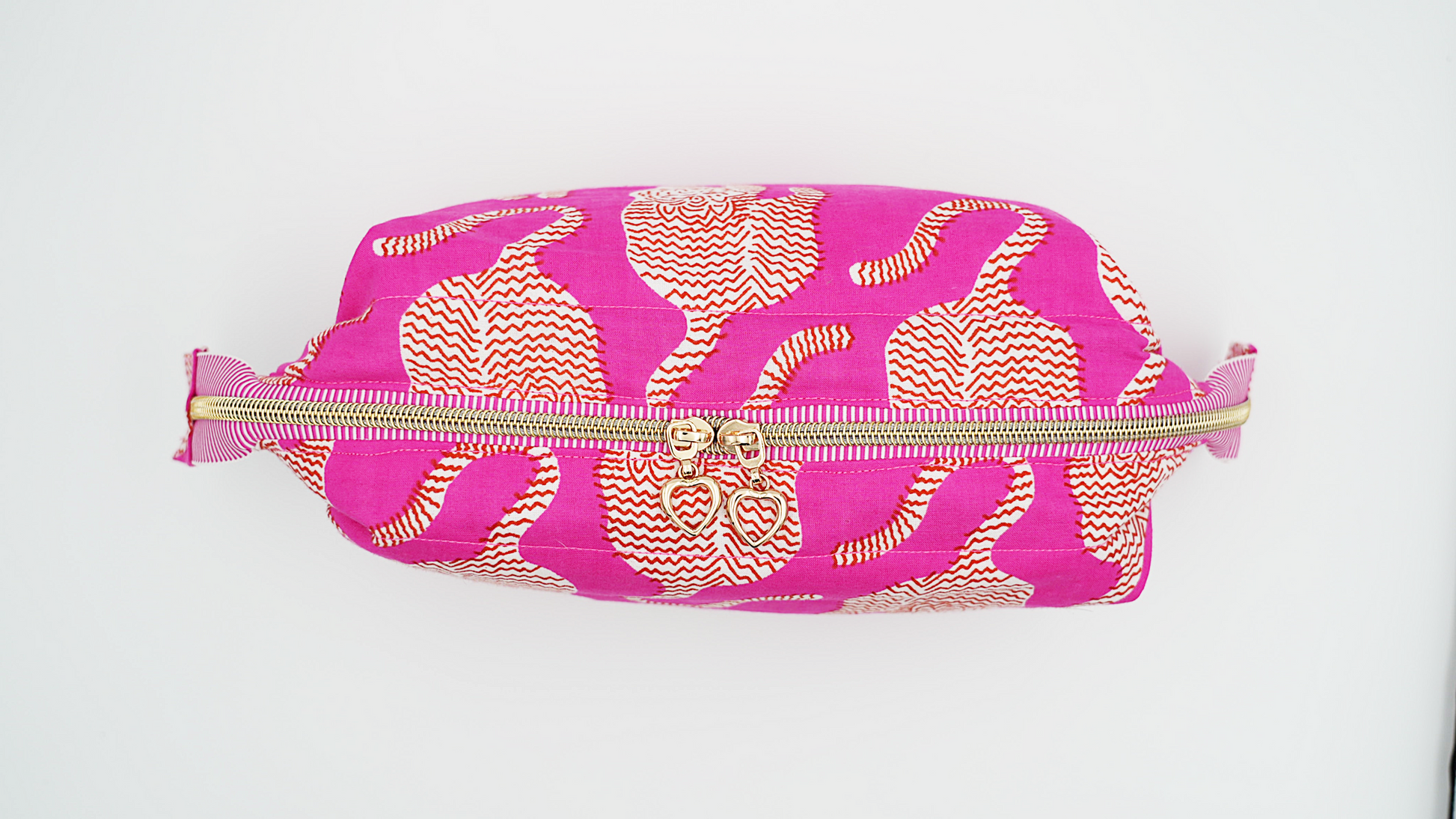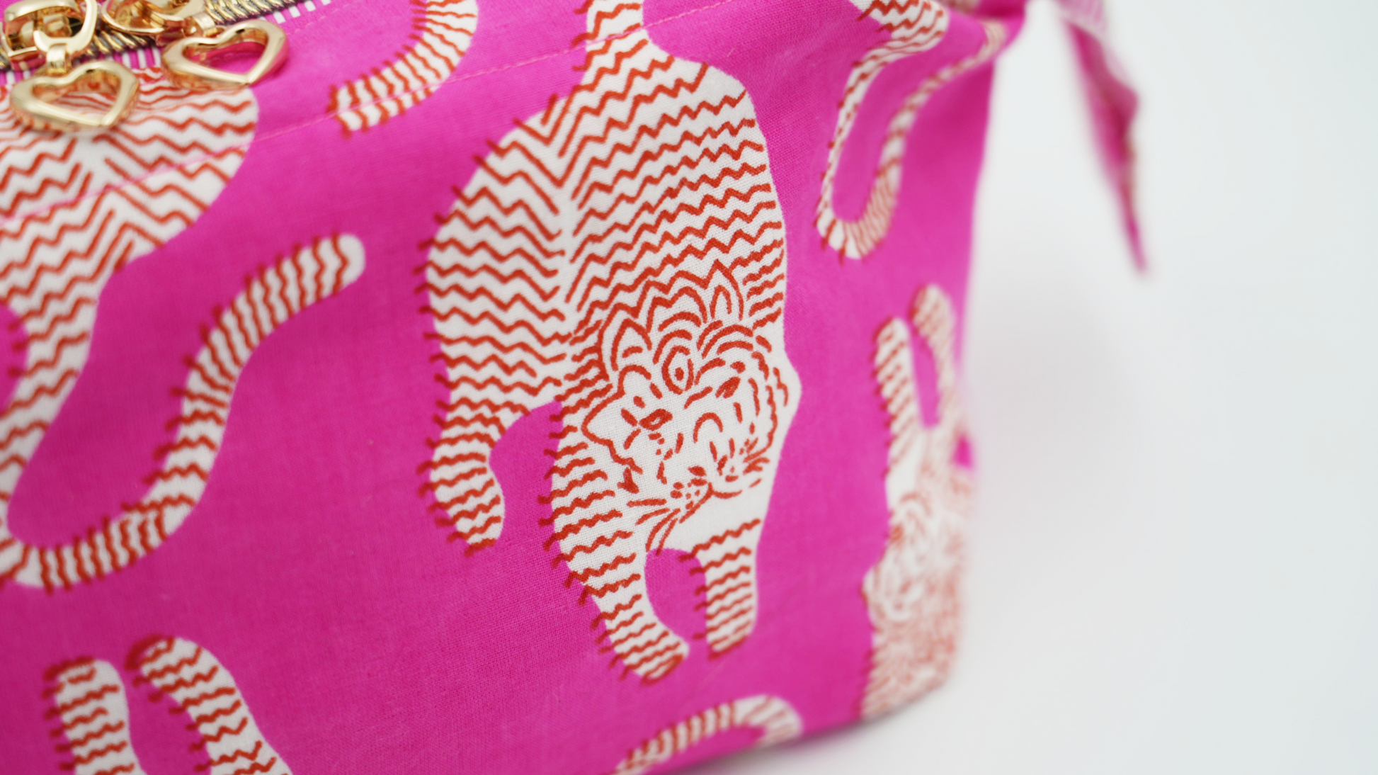 Brighten up your travel essentials with this handmade tiger wash bag featuring a bold hot pink Indian block print. Compact yet roomy, it’s perfect for storing toiletries, cosmetics, or everyday essentials — all while adding a unique, artisanal touch to your routine.