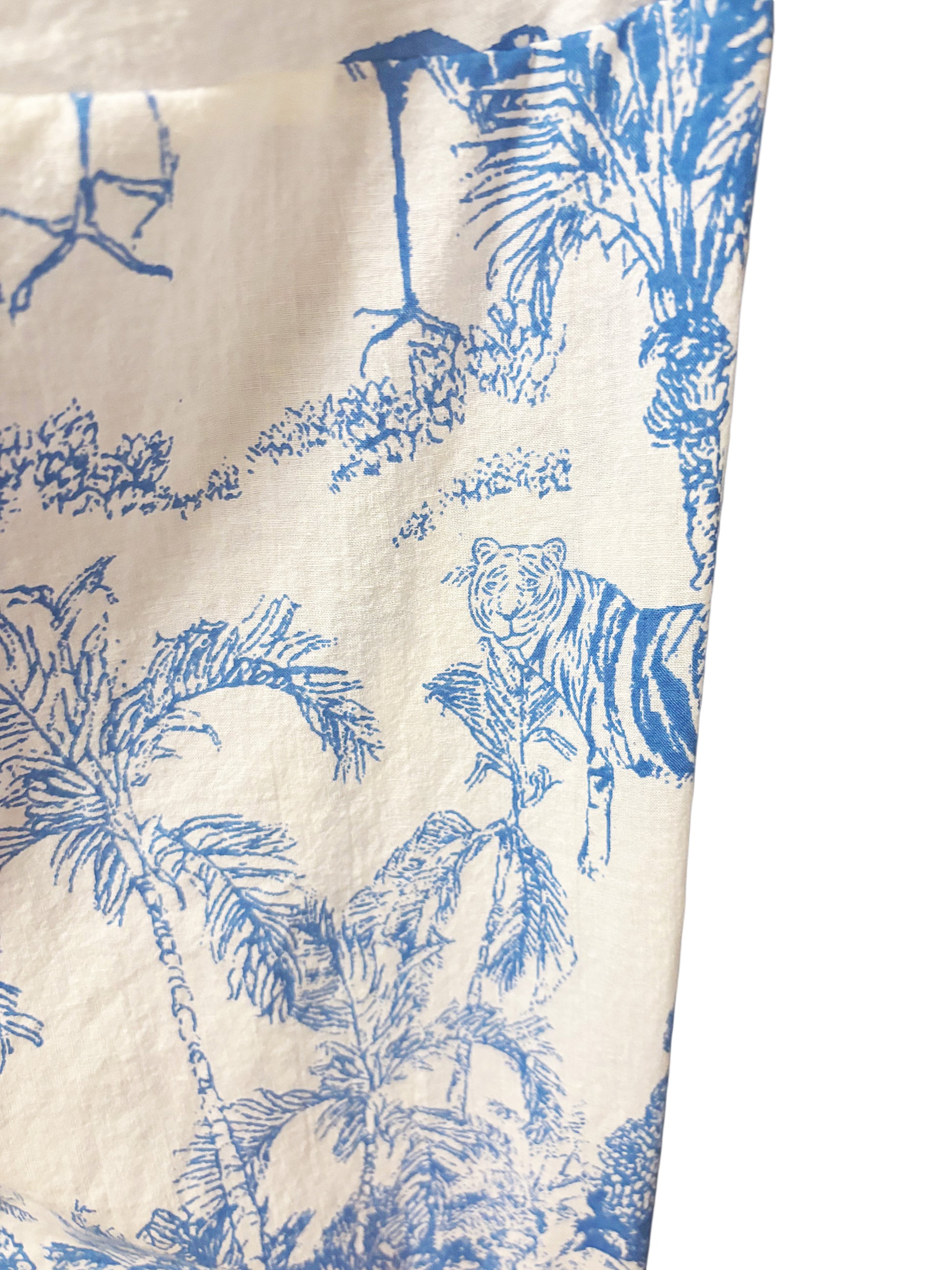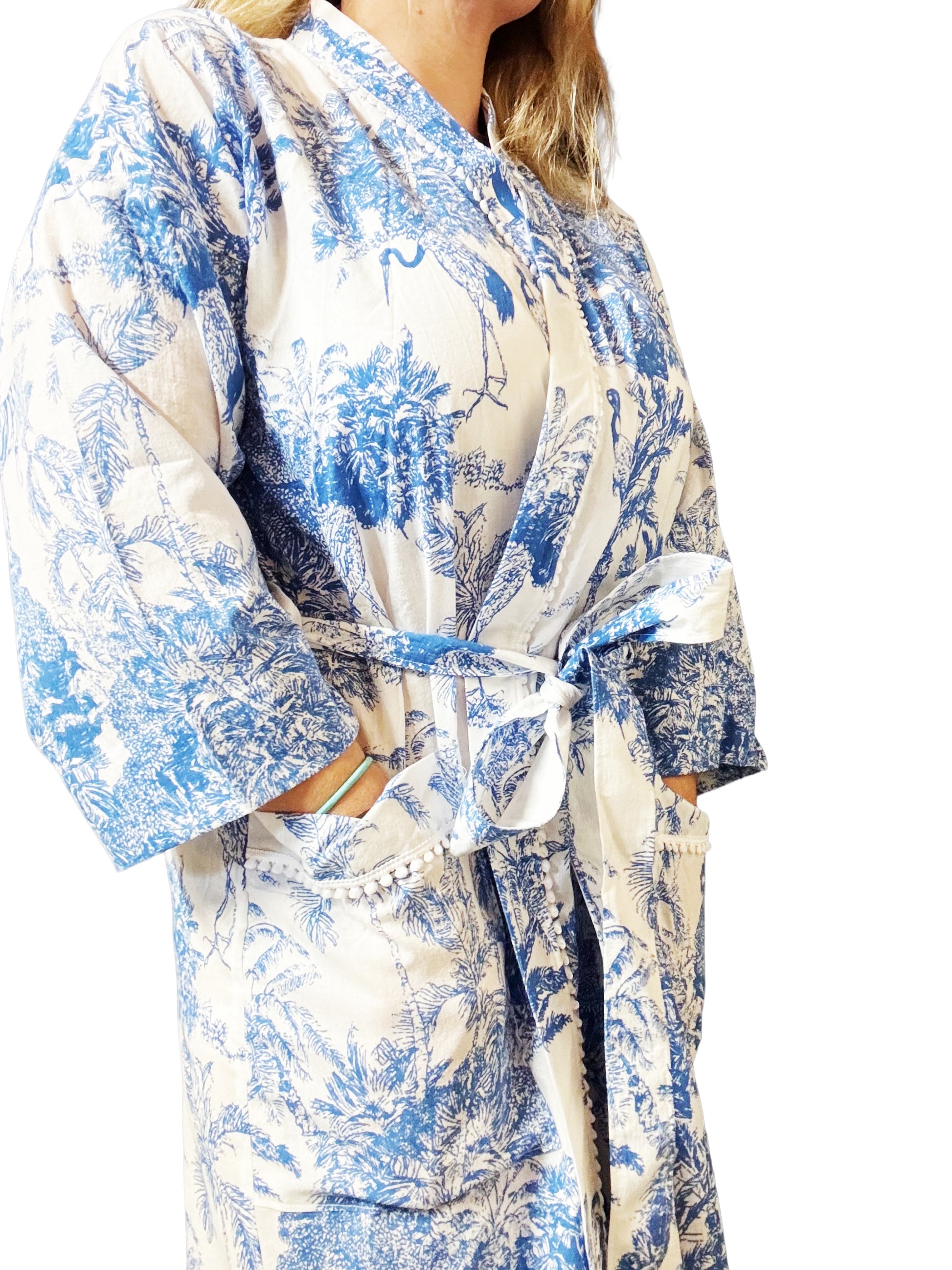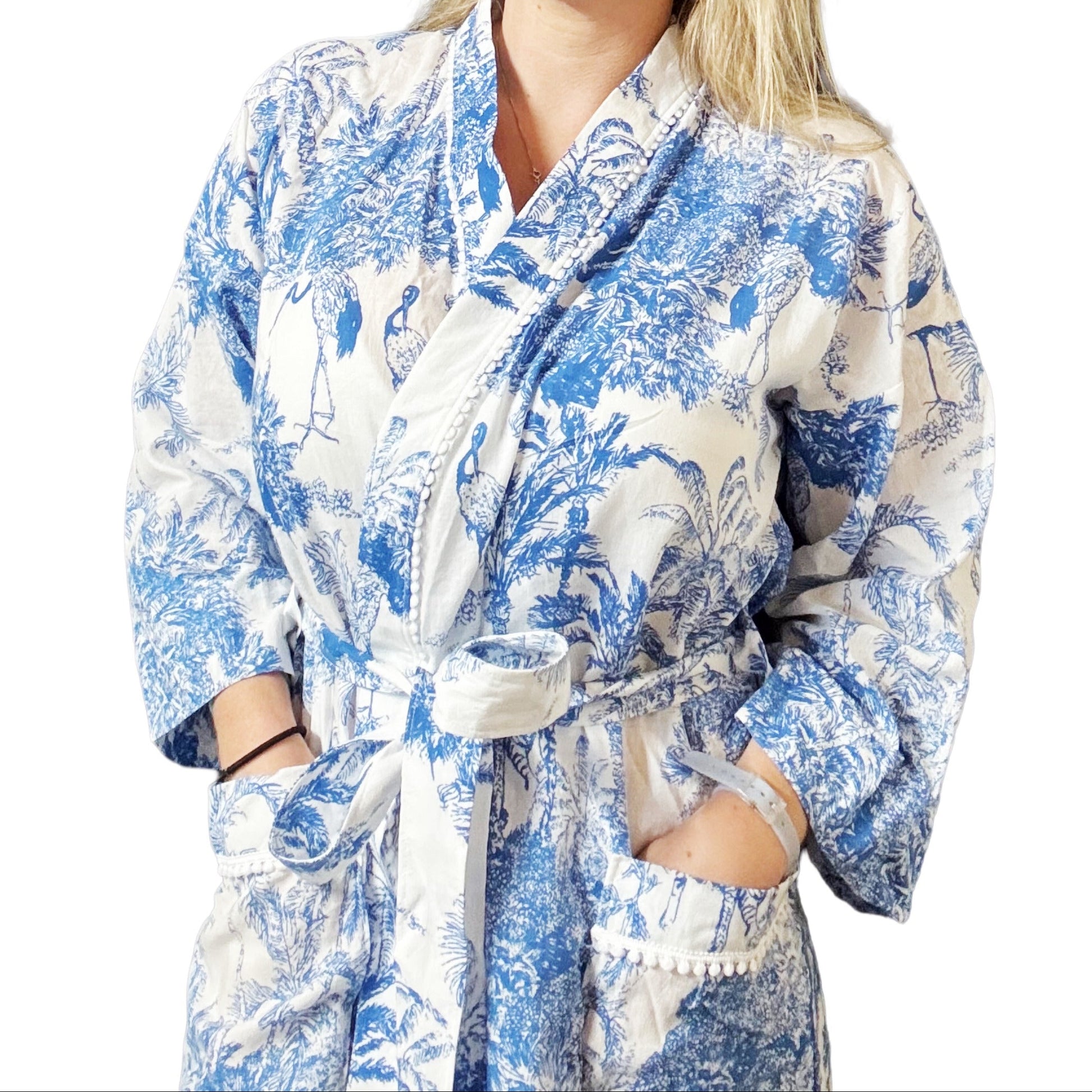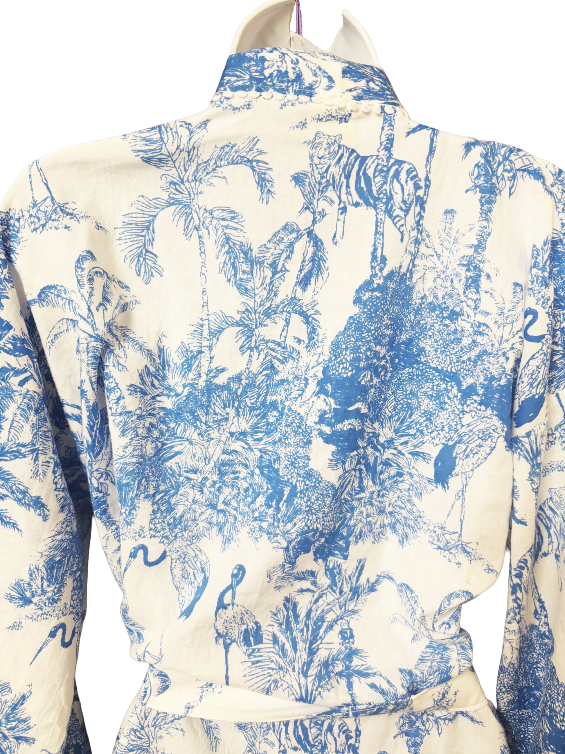 Featuring a stunning blue and white jungle print adorned with graceful cranes and majestic tigers, this robe captures the spirit of faraway lands while offering everyday comfort. Perfect for slow mornings, relaxing evenings, or adding a touch of luxury to your loungewear collection.