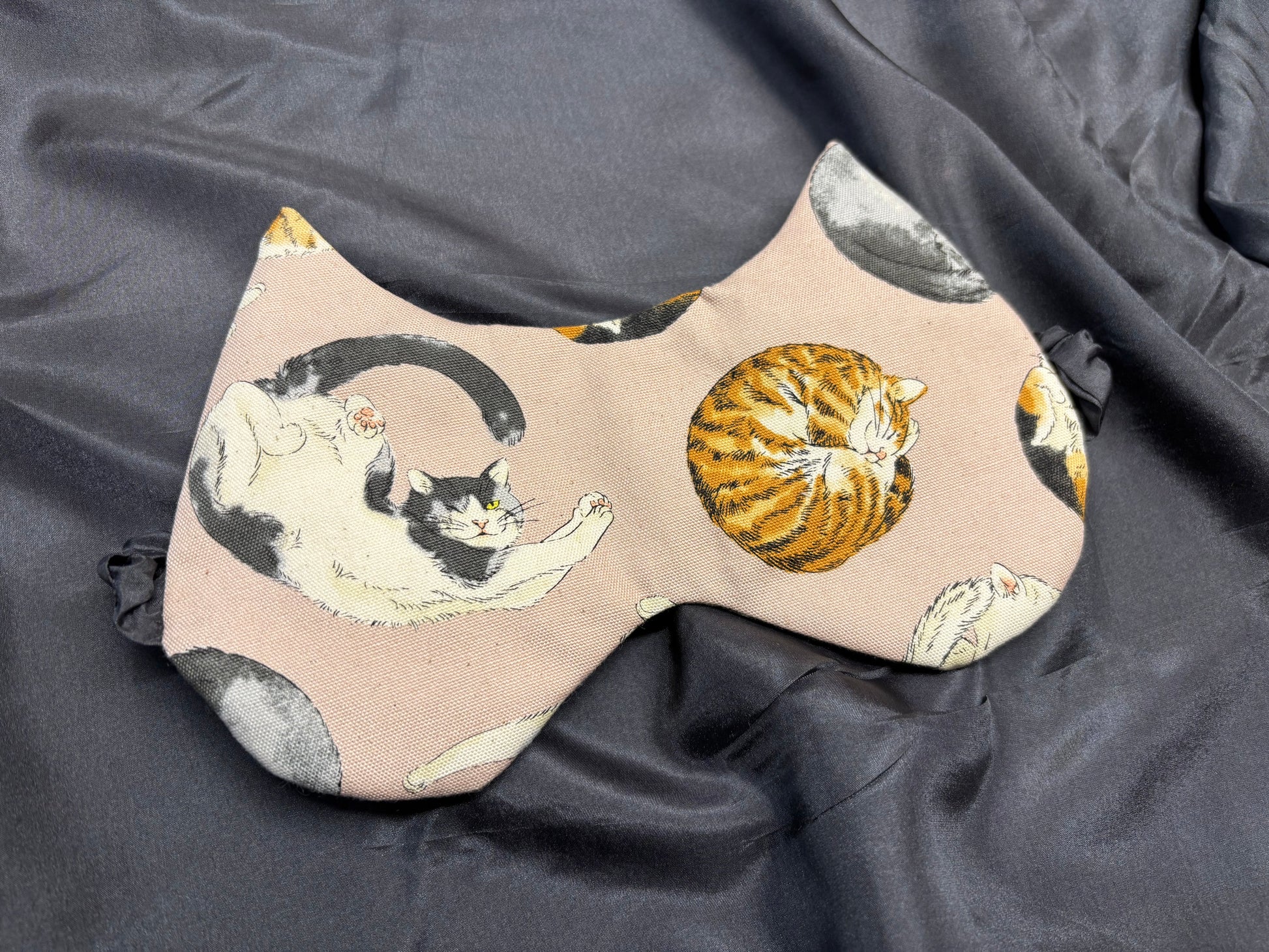 Handmade reversible sleep mask featuring a curled up sleeping cat print, travel eye mask filled with lavender. Made from soft cotton and silk comfort for flights, hotels, and on-the-go relaxation.