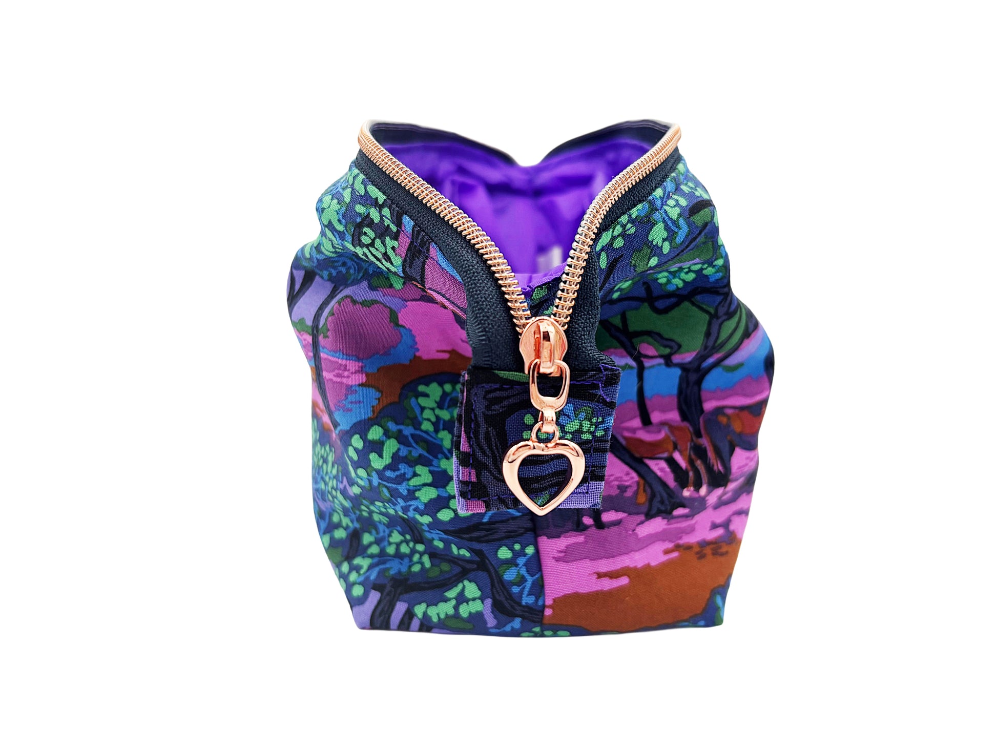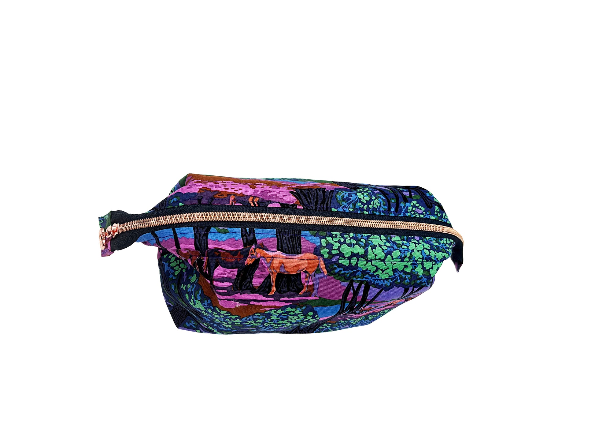 Bring a touch of countryside charm to your travels with this Handmade Cotton Wash Bag, featuring a beautiful New Forest pony and horse design in rich purple and navy tones.