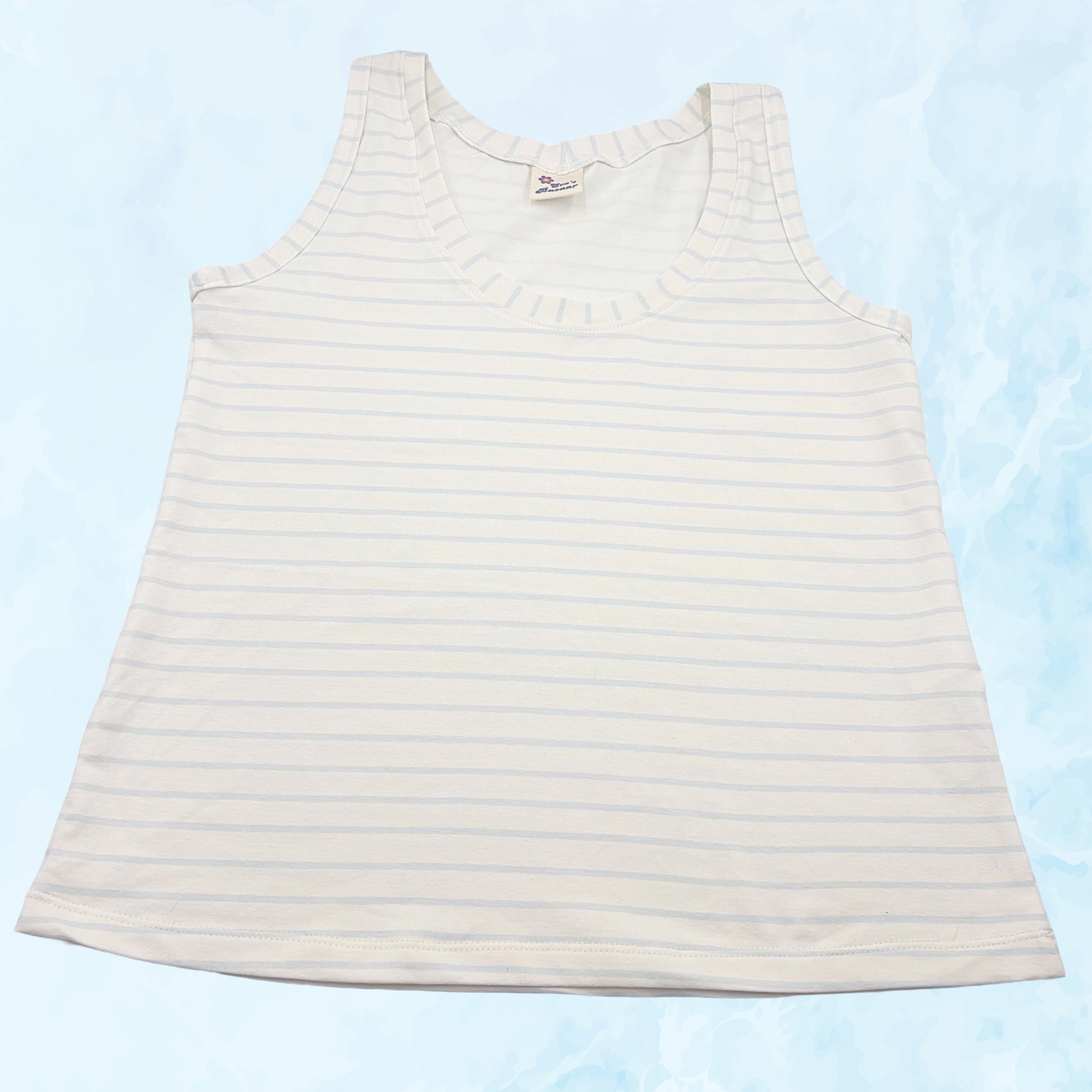 Keep cool and stylish with this Off-White and Baby Blue Stripe Jersey Vest, beautifully handmade in Cornwall from soft, breathable fabric.