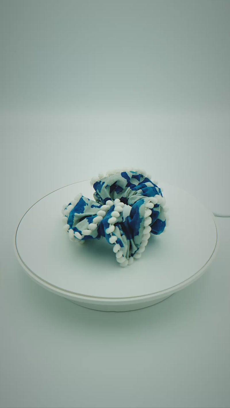 Paisley Indigo Hair Scrunchie with pompom trim
